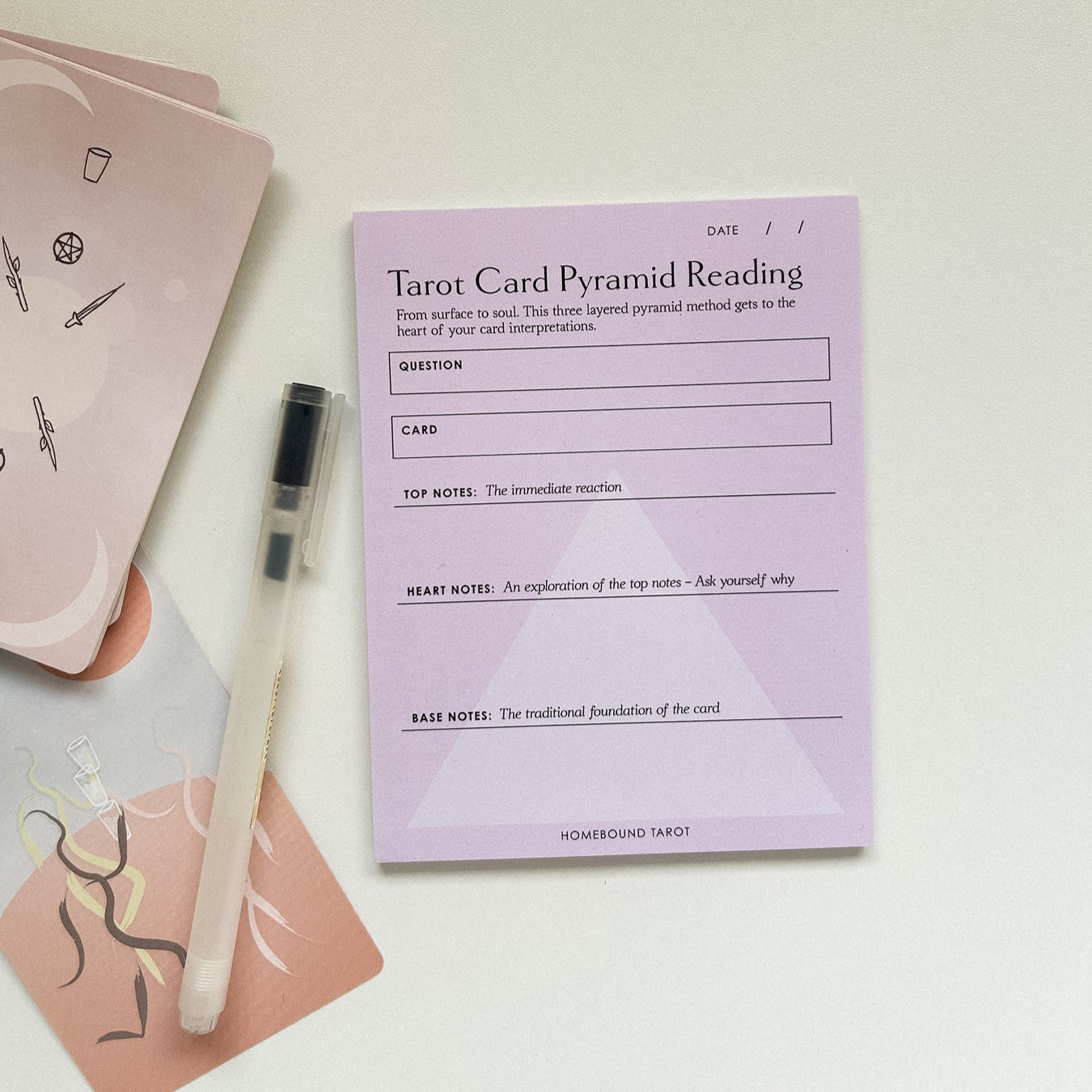 From surface to soul, this three layered pyramid method gets to the heart of your card interpreations. By putting focus on each level of interpretation, you can learn to distinguish between traditional card meanings and personal intuition. Tear away each day's reading and keep it stowed away in your tarot journal or daily planner to reflect back on.